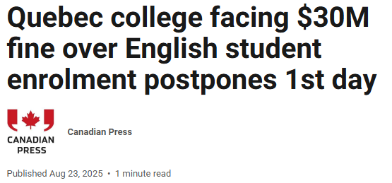 由于在英语授课项目中招收学生人数过多,一所位于加拿大魁北克的学院正面临3000万加元的罚款,因此该校决定暂停原定于周一的开学日。 ![]() ![]() 图源Pierre Obendrauf /Montreal Gazette 拉萨尔学院(LaSalle College)在一份声明中表示,暂停上课的决定与蒙特利尔校区所面临的罚款有关。学院同时表示,开学时间将推迟至周二,并保证此举不会影响学生的学业进度。 魁省政府此前出台了一项语言法案(于2022年通过),限制英语授课项目的学生招生人数。此次罚款即源于该项法律规定。 学院首席执行官Claude Marchand在领英(LinkedIn)发文指出,尽管学院呼吁政府宽容处理,并且在2025学年已完全符合法规要求,但政府仍然坚持削减该校的运营补助,态度强硬。 对此,魁北克高等教育部长Pascale Déry指责学院在与政府谈判期间“拿学生当人质”。她还在X平台上发文强调,拉萨尔学院是唯一一所未遵守招生配额的获得政府资助的私立学院。 来源:加拿大留学生问吧 编辑(Edit)     删除(Delete) |