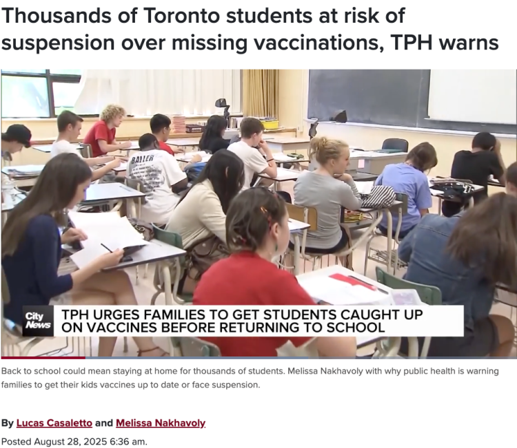 暑假即将结束,劳工日长周末过后,孩子们将于开始新的学年,不过,多伦多卫生局发出警告称,仅仅416地区就有14万学生可能面临停学处罚,原因是没有打疫苗。 ![]() 今年秋季,多伦多公共卫生局 (TPH) 加大力度,确保学生在返校前完成强制性疫苗接种。 多伦多公共卫生局宣布将对不遵守安大略省《学生免疫法》的学生实施停学处罚。 多伦多公共卫生局 (TPH) 表示,如果没有疫苗接种证明,学生可能会面临 20 天的停课处罚。 根据安省《学生免疫法》,学生要求接种9种可预防疾病的疫苗,包括: 麻疹 腮腺炎 风疹 白喉 破伤风 脊髓灰质炎 百日咳 脑膜炎球菌 水痘——适用于2010年或以后出生的学生 ![]() “6月份,我们评估了记录,发现多伦多市约有14万名学生未按时接种疫苗,”多伦多卫生部副医务官维尼塔·杜贝医生(Vinita Dubey)说道。 “我们在夏天发出了14万封信,很多家长都收到了这些信,他们也应该采取行动。” 由于多伦多公共卫生局(TPH)发现2至5年级学生的疫苗接种记录比例较低,因此今年秋季的重点是这些学生。 安大略省自从去年10月份开始爆发麻疹疫情,截至8月19日,安大略省已报告共2363例麻疹病例。 目前,每周病例数已显著下降,8月12日至8月19日期间仅新增1例。 安大略省公共卫生局表示:“虽然每周病例数的下降趋势表明传播速度正在放缓,但仍需保持警惕。” 根据最新数据,73.1% 的麻疹轻微病例(1,728 例)发生在 19 岁或以下的人群中,而 96.4% 的婴儿、儿童和青少年病例未接种疫苗。 多伦多公共卫生局 (TPH) 表示,如果没有疫苗接种证明,学生可能会面临 20 天的停课处罚。 “这些疫苗拥有良好的记录。它们被广泛使用和研究,”杜贝博士说。“它们已被证明非常安全,而且效果也非常好。” 出于医疗或宗教原因,允许豁免;然而,TPH 指出,绝大多数学生必须在整个学年都受到保护。 “如果学校出现接触病例,比如有人在学校用餐时被感染,那么整个学校都将被视为接触病例或处于危险之中,”杜贝博士强调。 “任何未及时接种疫苗或未获得免疫力的人将被立即禁止进入学校。” 编辑(Edit)     删除(Delete) |
