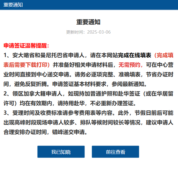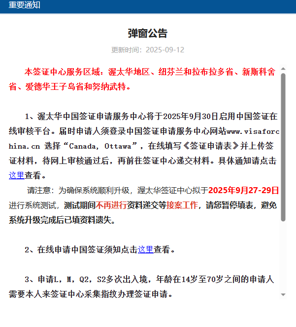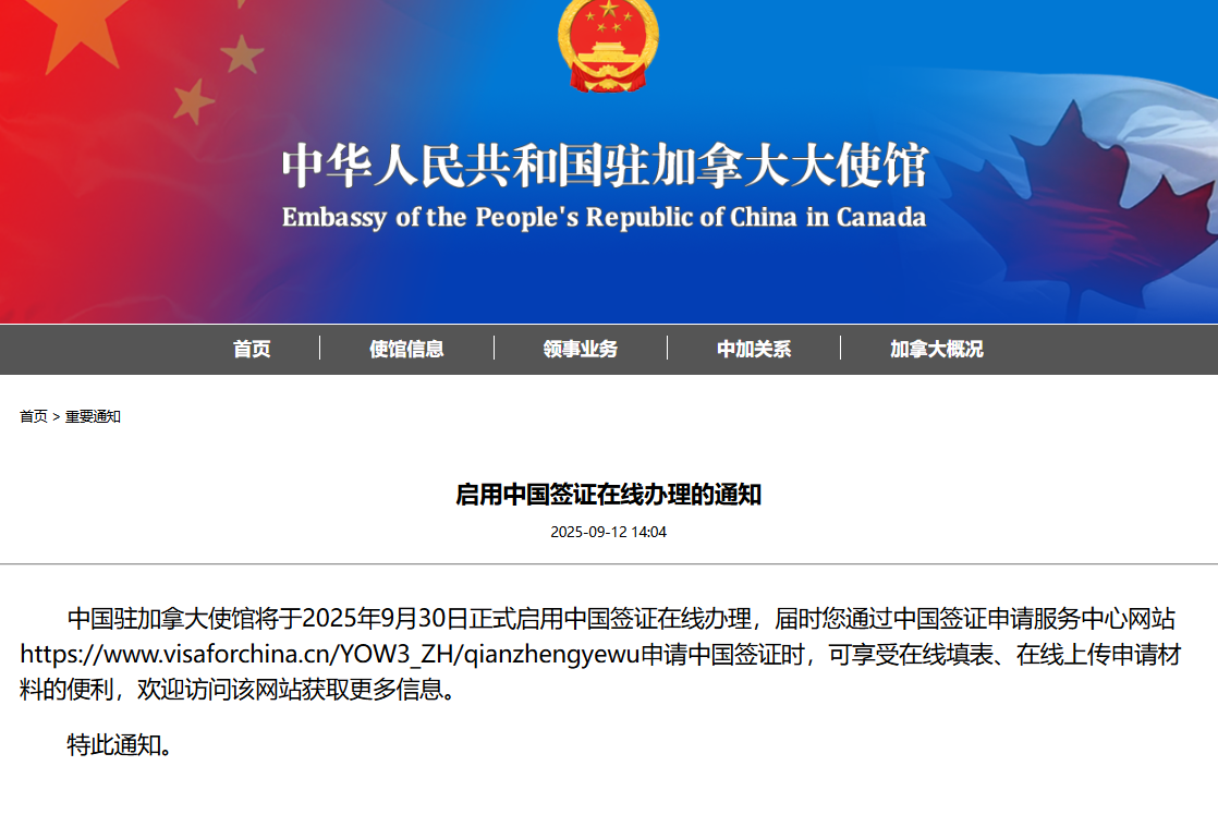 9月12日,中国驻加拿大 使馆官网发布通知,宣布将全面启用签证在线办理。通知如下:中国驻加拿大 使馆将于2025年9月30日正式启用中国签证在线办理,届时您通过中国签证申请服务中心网站申请中国签证时,可享受在线填表、在线上传申请材料的便利,欢迎访问该网站获取更多信息。 ![]() 渥太华签证中心通知说: 1、渥太华中国签证申请服务中心将于2025年9月30日启用中国签证在线审核平台。届时申请人须登录中国签证申请服务中心网站www.visaforchina.cn 选择“Canada, Ottawa”,在线填写《签证申请表》并上传签证材料,待网上审核通过后,再前往签证中心递交材料。具体通知请点击这里查看。 请注意:为确保系统顺利升级,渥太华签证中心拟于2025年9月27-29日进行系统测试,测试期间不再进行资料递交等接案工作,请您暂停填表,避免系统升级完成后已填资料遗失。 2、在线申请中国签证须知点击这里查看。 ![]() 3、申请L,M,Q2,S2多次出入境,年龄在14岁至70岁之间的申请人需要本人来签证中心采集指纹办理签证申请。 4、关于免签政策相关问题,请查看中国驻加拿大 使馆网站: https://ca.china-embassy.gov.cn/ 5、签证中心咨询邮箱:ottawacenter@visaforchina.org 本签证中心服务区域:渥太华地区、纽芬兰和拉布拉多省、新斯科舍省、爱德华王子岛省和努纳武特。 多伦多签证中心此前已经实行此制度: ![]() 升级为签证在线审核模式后,签证申办流程如下: (一)准备签证申请材料 请按照您申请的签证种类, 准备申请材料。 (二)在线填写《签证申请表》并上传申请材料 请 您 登 录 中 国 签 证 申 请 服 务 中 心 ( 以 下 简 称“签证中心”)网站www.visaforchina.cn,选择加拿大所在地点,注册后登录。根据提示在线填写《签证申请表》、上传申请材料并提交,等待初审通过。 注意:您须在确认费用页面再次点击“提交/Submit”按钮,该次申请才正式完成在线提交,否则状态为 “PENDING”(未完成在线提交流程)。 线上审核时长:自提交申请表后约 3-5 个工作日。(如因表格填写有误或上传资料不全导致需要驳回修改,您的线上审核时间将会延长)。 提交申请后,签证中心可能需要您进一步提供材料,请前往“申请进度查询”及时了解申办进度。待申请状态为“待递交护照”或“通过”时,打印《签证申请表》首页和最后一页并签字。 您可以随时登录您的账号查询申请状态: • 若状态显示为“To be modified”,根据邮件或系统提示修改或补充申请材料。 • 若状态显示为“Unapproved”,审核不通过。 • 若状态显示为“Online review completed”,请打印邮件附件《签证申请凭证》并携带邮件中提示要带来签证中心的文件及《签证类型及材料清单》中要求提交的资料原件及复印件至签证中心缴费。 (三)到签证中心递交签证申请材料并缴费 1. 收到确认邮件后,申请人即可携带打印的邮件附件:《签证申请凭证》,于工作日 9:00 至 15:00 到所在签证中心递交签证申请材料、采集生物信息并缴费。 2. 到所在签证中心提交如下材料:护照原件;《签证申请凭证》;《签证申请表》首页和最后一页并签字;证件照片 1 张(半年内近照、免冠、白底彩色、小2 寸、不可佩戴饰品);《签证类型及材料清单》中要求提交原件的材料及其他相关材料(例如邀请函、原中国护照、出生证明文件等); 3. 申请人需到签证申请中心采集指纹。 4. 建议需要双向邮寄服务的申请人(须符合免采指纹)至少提前一个月递交线上申请,待线上审核通过后,才可进行邮寄。 5. 递交申请材料时须缴纳全部费用,费用包含签证费、签证服务费、税费、邮寄服务费(如适用)。 以下签证申请人可免采指纹: • 未满 14 周岁或已满 70 周岁人员; • 持外交护照或符合中国外交、公务、礼遇签证审发条件人员; • 五年内持同一本护照在同一中国使领馆(或签证中心)申办过生物识别签证并采集过指纹的人员; • 十指手指均残缺或十指指纹均无法留存人员; 特别提示:所在签证中心不负责中国签证的审批;中国驻加拿大 使馆根据中国有关法律和规定决定是否颁发签证、颁发何种签证及签证的有效期等。如果签证申请未被中国驻加拿大 使馆批准,或被拒签,或入境次数、有效期、停留期被更改,将据实收取签证费,且不退还服务费。 到中心递交材料后申请签证所需时间:普通件 4 个工作日、加急件3 个工作日、特急件 2 个工作日。 (四)领取证件 请您凭递交申请时获发的取证单,在相应的预计取证时间到所在签证中心领取证件。 特别提示:如签证官要求补充材料或正在审核中,您的取证日期将会延后。 以上关于签证在线办理和审核的流程及信息均摘录自中国签证中心的网上信息,可能发生变化,一切以当地签证中心的规则、流程和说法为准。 来源:加国无忧 编辑(Edit)     删除(Delete) |