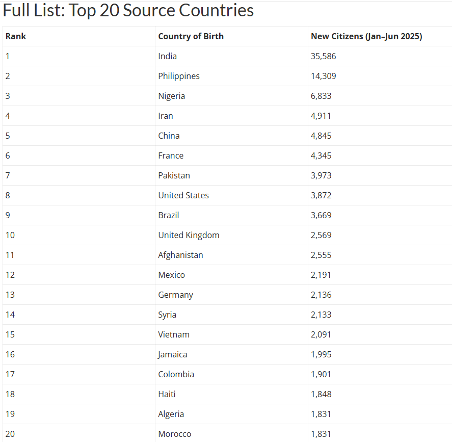 加拿大依然是全球移民的首选目的地之一,每年都有成千上万名永久居民成为加拿大公民。2025年上半年,新入籍加拿大公民的出生国家排名反映了加拿大移民体系的多元性与强大吸引力。2025年上半年加拿大入籍数据出人意料,印度人入籍数是华人的7倍还多,华人只能排第五,共有4,845人,不及印度人入籍数零头,甚至不及尼日利亚和伊朗。 ![]() 图源:immigration 数据显示,印度依然是加拿大新公民的最大来源国,2025年1月至6月期间共有35,586名印度出生人士成为加拿大公民。 菲律宾以14,309名新公民位列第二,凸显了加拿大与东南亚之间紧密的移民 联系。 尼日利亚、伊朗和中国分列前五,其各自都有超过4,000人获得加拿大公民身份。 值得注意的是,多个欧洲和中东国家也进入了前20名榜单,显示出加拿大移民来源的全球广泛性。 完整名单:前20名来源国 (2025年1-6月) 1 印度 35,586 2 菲律宾 14,309 3 尼日利亚 6,833 4 伊朗 4,911 5 中国 4,845 6 法国 4,345 7 巴基斯坦 3,973 8 美国 3,872 9 巴西 3,669 10 英国 2,569 11 阿富汗 2,555 12 墨西哥 2,191 13 德国 2,136 14 叙利亚 2,133 15 越南 2,091 16 牙买加 1,995 17 哥伦比亚 1,901 18 海地 1,848 19 阿尔及利亚 1,831 20 摩洛哥 1,831 数据背后的趋势 ![]() 经济移民主导:印度、菲律宾、尼日利亚等国的技术移民、留学转PR路径依旧强劲。 难民政策持续发力:叙利亚、阿富汗、海地进入前20,显示加拿大对人道主义安置的承诺。 发达国家依旧青睐:美国、英国、法国等传统强国依然有大量移民选择加入加拿大籍。 常见问题 2025 年上半年哪个国家的新加拿大公民最多? 印度成为加拿大公民的人数最多,2025 年 1 月至 6 月期间共有 35,586 人成为加拿大公民。 2025 年初有多少新公民来自菲律宾? 有 14,309 名加拿大新公民出生在菲律宾,位居第二。 难民来源国是否进入前 20 名? 是的。叙利亚、阿富汗和海地等国家都进入了前20名,这反映了加拿大在难民安置方面的努力。 这些数据是否仅包括成为公民的永久居民? 是的。这些数字反映了2025年上半年符合资格标准并正式获得加拿大公民身份的永久居民。 为什么美国、英国等国家仍然出现在名单上? 许多来自美国和英国的外国人为了工作、家庭或教育而移居加拿大,后来选择加入加拿大公民行列。 来源:加国无忧 编辑(Edit)     删除(Delete) |