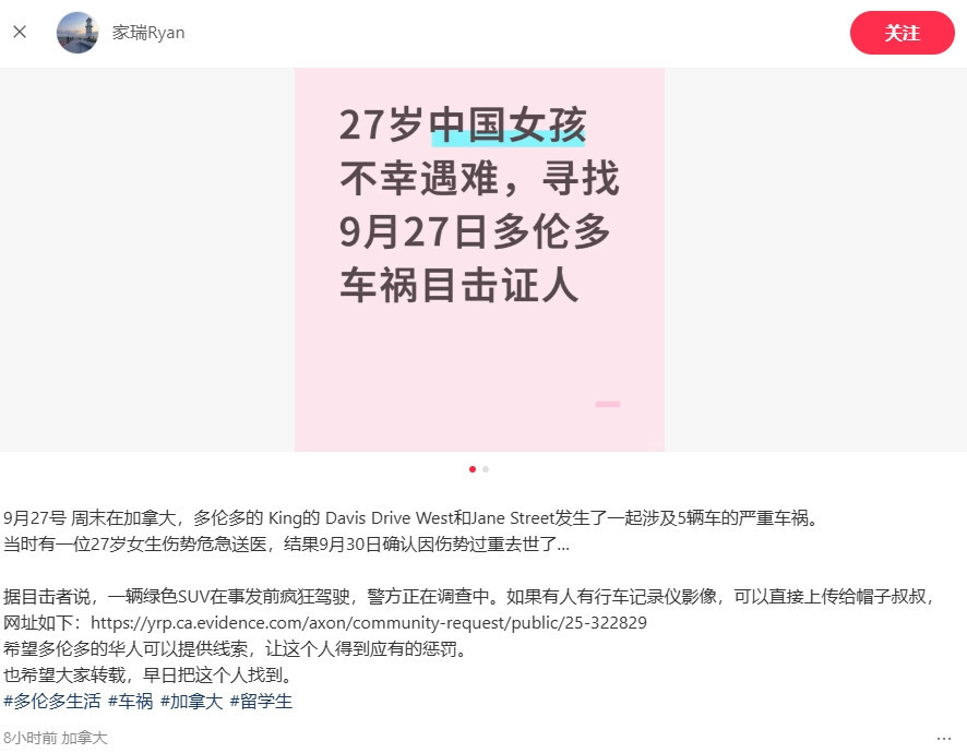 大多伦多King镇上周末发生的一宗严重的多车相撞事故,目前已由约克区警方重大交通事故调查组接手,作为致命车祸进行调查。 ![]() ![]() 图源:YRP 9月27日(周六)下午约4点30分,警方接到多起报警,称在Davis Drive West 与Jane Street附近发生多车相撞事故。警员到场后发现事故涉及五辆车辆。 其中一名乘客被紧急送往创伤中心,情况危殆。 然而在9月30日(周二),该名来自密西沙加市的27岁女子因伤势过重,不幸身亡。 有知情的华人网友透露,这名女子是来自中国的留学生。 ![]() 图源:小红书 警方称,事故中的两名司机和两名乘客没有受伤,另有两名司机受轻伤,一名司机受重伤但无生命危险。 目击者告诉调查人员,在车祸发生前不久,一辆绿色SUV在事发区域以危险方式驾驶。 警方呼吁尚未与警方联系的目击者,或任何在当时路段有行车记录仪影像、尤其是拍到该绿色SUV的司机,请尽快提供线索。 视频可通过以下链接上传:https://yrp.ca.evidence.com/axon/community-request/public/25-322829或扫描警方提供的二维码。 案件仍在调查中。 知情网友表示:”希望多伦多的华人可以提供线索,让肇事者得到应有的惩罚。也希望大家转发,早日把这个人找到。“ 知情人士请联系约克区警队重大交通事故调查组,电话 1-866-876-5423,分机7704。匿名举报可致电 灭罪热线1-800-222-TIPS 或访问 www.1800222tips.com。 来源:加国无忧 编辑(Edit)     删除(Delete) |