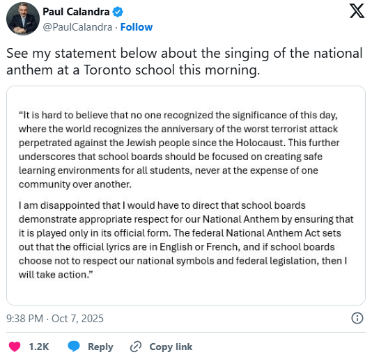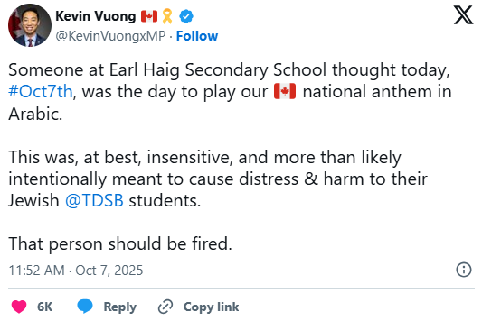 安省教育厅长Paul Calandra获悉,一所多伦多高中在周二上午,也就是哈马斯袭击以色列造成超过1200名以色列人死亡、超过240名人质(其中约48人仍被扣押)的两周年纪念日,竟然用阿拉伯语播放了国歌。 为此,他向这所学校发出了警告。 这所名叫Earl Haig中学的公校位于北约克,Yonge街和Sheppard大道附近,有大约2000名学生。它也是Claude Watson艺术项目的所在地,这个项目于1982年成立,提供艺术和学术教育。 ![]() Earl Haig Secondary School 图源:Google Map 教育厅长Calandra周二晚在社交媒体上发帖说:“很难相信,竟然没有人意识到这一天的重要性,全世界都在纪念自大屠杀以来,犹太人民所遭受的最严重的恐怖袭击周年。” 他还说:“这再次表明,教育局应该专注于为所有学生创造一个安全的学习环境,而不是为了一个社群而牺牲另一个。” ![]() 图源:X 周二的媒体报道指出,这所学校当天上午通过广播系统用阿拉伯语播放了加拿大国歌《O Canada》。 一位学校消息人士告诉Juno News:“他们有一张CD,里面有英语、法语、梅蒂斯语、波斯语和阿拉伯语版本的《O Canada》。今天,他们决定播放阿拉伯语版本。” 消息人士还补充说,校长随后做了一个简短的广播。“他说这对我们社区来说是艰难的一天,并鼓励学生们在需要支持时向朋友求助。他没有具体提到10月7日。” Calandra表示,他对此感到“失望”,他不得不联系这所学校,提醒他们自己的责任。 他补充道:“联邦的《国歌法》规定官方歌词是英语或法语。如果校方选择不尊重我们的国家象征和联邦法规,那么我将采取行动。” 多伦多前国会议员Kevin Vuong也在社交媒体上发言:“这往好听了说是麻木不仁,更糟糕的是,很可能是故意要给他们的犹太学生造成痛苦和伤害。”他补充说,做出这个决定的人“应该被开除”。 ![]() 图源:X Earl Haig中学的网站显示,其社团列表中有一个“犹太学生会”(JSU),在其家长手册(有中文、韩文和波斯语版本)的英文版中,也列出了“犹太家庭与儿童服务处”的联系方式。媒体报道称,该校大约有100名学生是犹太人。 National Post已联系该校、校长和犹太学生会,请求他们对此事发表评论。 来源:加国无忧 编辑(Edit)     删除(Delete) |