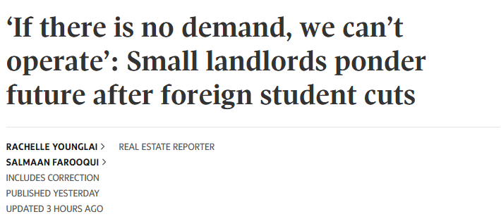 图源:Darren Calabrese/The Globe and Mail Kitchener地产经理Noah Koop说,现在一些房东“急得发慌”。“把所有赌注压在学生房上,过去可以,现在真是让人抓头。” 为了拉租客,大型物业公司甚至在楼外搭帐篷,现场“拦人”劝租。 往年这种事只会出现在8月,今年却延续到了9月。 房东们集体“肉疼”:租金暴跌、贷款飙升 许多“疫情期间”入市的个人房东,当时贷款利率不到2%,如今却面对高利贷和下降的租金收入。 Royal York物业公司创始人Nathan Levinson透露,他管理的多个学生房源租金下跌$700~$800,许多房东连降价$100都吃力,如今面对近$800的跌幅,已难以支撑。 新斯科舍省房东协会负责人Kevin Russell表示,去年6月,房东们开始发现租房申请变少,几个月后就纷纷开始打折求租。 过去几年,留学生几乎是加拿大租房市场的“刚需支撑”。如今,这个支撑被突然抽走,究竟是治标还是伤筋动骨? 来源:加拿大留学生问吧 编辑(Edit)     删除(Delete) |