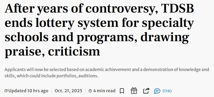 图源:X@tdsb 从“抽签入学”回归“凭实力选拔” 新的招生办法规定: • 小学特色课程申请者必须提交评估用的作品集或试演视频; • 中学项目申请者将依据学生的成绩单(占30%)与作品集、试演或入学测验(占70%)的总分进行录取。 录取过程将由教育局评审团队统一审查,不再对任何族群设定优先权。 2026年9月入学的申请将于2025年11月10日当周开放,12月1日中午截止。 安省教育厅长Paul Calandra在声明中表示:“我们的教育政策核心是提升学生学习成果。过去的抽签制度辜负了那些努力争取入学资格的学生。恢复以成绩与能力为依据的公平录取制度,旨在确保学生的努力与成就得到应有的认可。” 华人教育委员:勤奋终于有意义了 TDSB教育委员裴卫东(Weidong Pei)表示,这一决定实现了他竞选时的承诺。“努力再次有了意义。抽签制伤害了那些它声称要帮助的学生,也传递了一个令人沮丧的讯息——勤奋和努力一文不值。” 他形容抽签制度不过是“披着公平外衣的激进社会实验”。 不同群体意见分化 虽然许多家长和学生拍手称快,但仍有人对取消抽签表示失望。 TDSB家长参与顾问委员会成员Katrina Matheson指出:“没有经过家长咨询就做出决定,让人感到失望。” 她希望教育局未来能在维持项目质量的前提下,探索“更公平的录取机制”。 另一位拥有三名原住民子女的家长Midori Miyamoto则表示失落。她的儿子通过抽签进入以社会正义为核心的特色中学Ursula Franklin Academy,她坦言:“如果不是抽签,他可能根本进不了这所学校。这是他第一次真正喜欢上学。” 背景:抽签制度曾为公平而生 过去多年,TDSB 的特色课程由各校独立录取,主要依据成绩、试演、作品集和面试。但批评者指出,这种“择优”模式让有资源的家庭占据优势。 多伦多大学2017年的一项研究也发现,TDSB艺术项目中的学生白人比例几乎是普通学生的两倍,且多来自富裕家庭。 为改善教育公平,TDSB于2022年5月推出抽签录取政策:学生只需表达兴趣即可申请。 • 政策优先录取原住民学生,并为黑人、拉丁裔及中东裔学生保留20%名额; • 在数理与科技类课程中,女生保留一半名额。 • 当申请人数超出名额时(几乎每次都如此),便采用随机抽签。 然而,该制度推行后引发巨大争议:反对者认为,抽签让高动机学生失去机会,也使班级水平参差不齐,反而制造了新的不公平;支持者则认为,随机抽签有助于削弱家庭经济差距对录取的影响。 省府接管后政策逆转 随着抽签政策持续争议,TDSB原计划在今年秋季进行公开咨询与政策检讨。但在6 月,安省政府以“财务管理不善”为由接管TDSB,并任命Rohit Gupta为省级监督官。他上任后取消了原定的咨询程序,直接主导修订政策,最终宣布恢复以成绩与能力为基础的录取制度。 新制度将于2026学年起全面实施。 申请人需提交2月与6月的成绩单,总成绩按30%学业+70%技能展示计算。已通过抽签录取的学生不受影响,但过去因抽签落选的学生,或有机会重新申请。 教育倡议团体Save Our Schools主席Bruce Yu称赞此举:“政府终于把学生利益放在首位。抽签是一场失败的社会实验,证据已经很清楚。” 不过,前教育委员Michelle Aarts 批评称:“以成绩单为门槛的标准具有排他性,这些改变带有政治动机。” 多伦多教育局这次回归“成绩与能力为本”的招生方式,可谓一场“教育公平与教育质量之争”的转折点。 来源:加国无忧 编辑(Edit)     删除(Delete) |