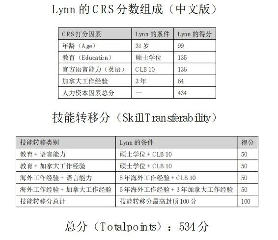 根据以上因素,Michael可以获得最近CEC的邀请。 示例 2: Lynn Jones是英国一家跨国企业的市场负责人。 她在这家公司拥有超过五年的海外工作经验,并在全职工作的同时,兼职完成了传媒与传播硕士学位。 在担任市场负责人一年之后,她通过公司内部调动(ICT)转移到加拿大分部工作。 她已经在加拿大分部工作了三年,因此符合 CEC 的申请条件。 她的英语水平非常优秀(CLB 10),提交快速通道档案时 31 岁。 根据这些因素,她的 CRS 分数如下: