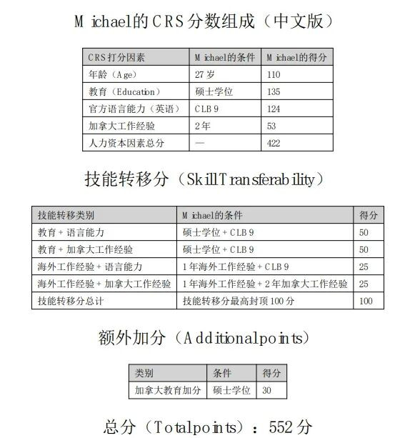 图源:canada.ca Michael Hassan是一名未婚工程师,大部分时间居住在阿联酋。 他在迪拜的一所大学完成了工程学学士学位,并在阿联酋一家公司担任了一年软件工程师。 之后,他来到加拿大攻读硕士,在多伦多大学完成了两年制硕士课程。 随后,他获得了有效期三年的毕业工签( PGWP),并完成了两年在加拿大担任云工程师的工作经验。 他拥有至少一年加拿大技术类工作经验,因此符合CEC的申请条件。 他的英语能力强,达到CLB 9水平,不会说法语。 他创建快速通道档案时27岁。 根据他的“人力资本因素”和工作经验,他的CRS分数如下: