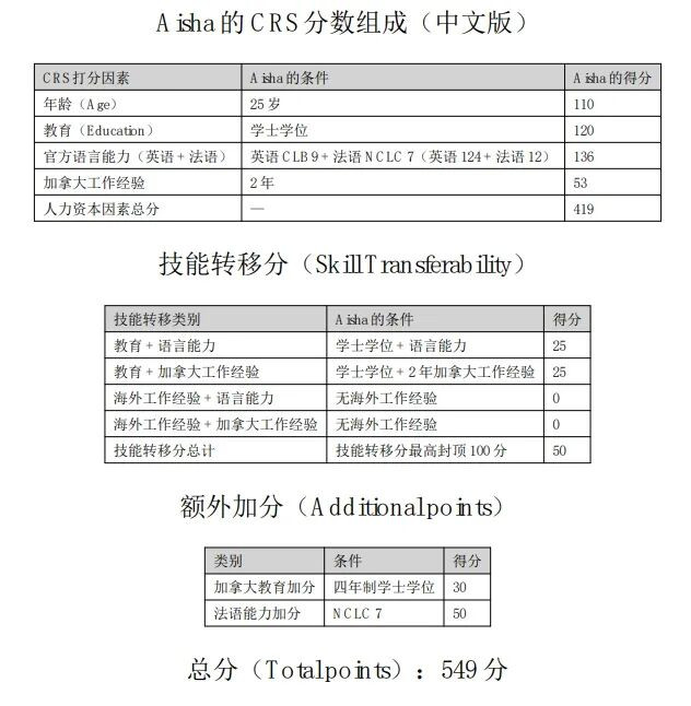 根据以上因素,以Neha为主申请人,Neha与Nikhil都会在CEC中收到 ITA。 示例 4: Aisha Jalal 来自尼日利亚,为攻读金融学学士学位而来到加拿大。 她在阿尔伯塔大学完成了四年的商业学学士学位。之后她获得三年期 PGWP。 她在找工作六个月后,获聘为加拿大一家银行的金融分析师,并累积了两年工作经验,从而符合CEC的申请要求。 Aisha英语优秀(CLB 9),法语也达到NCLC 7。提交快速通道档案时25岁。 根据她的人力资本因素与工作经验,她的CRS 分数如下: