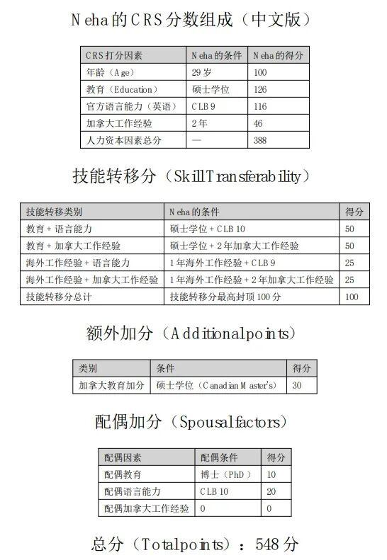 如果 Lynn 申请,她会达到最近 CEC 的邀请分数线。 示例 3: Neha Malhotra在德里完成了经济学学士学位,之后在印度担任增长分析师一年。 随后,她来到加拿大攻读两年制数据科学硕士学位。毕业后,她获得 PGWP,并在多伦多一家大型咨询公司累积了两年加拿大数据分析师经验。 Neha 英语水平优秀(CLB 9),不会法语。 提交快速通道档案作为主申请人的时候,Neha 29岁,丈夫Nikhil 35岁。 Nikhil 在印度完成博士学位,英语达到CLB 10,但没有加拿大工作经验,也不会法语。