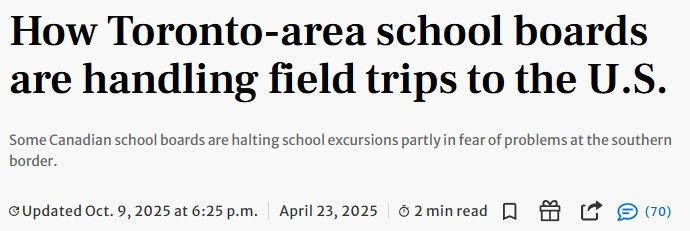 图源:51记者拍摄 据《星报》上月报道,随着加美关系紧张升级,加拿大各地陆续出现学校暂停前往美国旅行的趋势。约克天主教教育局(YCDSB)近日宣布 不再批准任何新的前往美国的学校旅行。此前,卑诗省最大教育局Surrey School District也暂停所有赴美行程;新不伦瑞克省的一个法语教育局更直接取消了学生纽约之行。 YCDSB表示,这项决定是基于“部分学生、教职员与社区成员对当前加美关系变化的担忧”。 发言人Mark Brosens指出,已获批准的校外赴美旅行仍会进行,但会采取额外安全措施,如校长或副校长随行、每天与旅行团联系等。教育局会在新学年重新评估赴美旅行政策。 大多区其他教育局的回应如下: 多伦多公校教育局(TDSB):没有系统性限制,也没有取消赴美行程。 多伦多天主教教育局(TCDSB):未取消相关旅行,但要求学生确保符合国际入境要求。 约克公校教育局、皮尔区、荷顿区教育局:所有行程继续照常进行,持续关注政府旅行警示。 杜兰区教育局:行程正常,但会加强随行人员、应急计划,并与使领馆保持联系。 Dufferin-Peel天主教教育局:行程照常,但提醒非加籍学生可能需要额外文件,并建议家长确保学生了解美国边检流程。 在多伦多以北的萨德伯里,当地天主教教育局也正式暂停所有赴美旅行。教育局主席Michael Bellmore表示,当前美国局势“混乱”,担心学生在边境遇到文件问题或因少数族裔身份而遭更严审查。他称,在“情况更明朗之前”,不会让学生承担额外风险。 来源:加国无忧 编辑(Edit)     删除(Delete) |