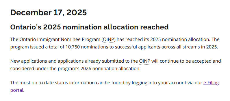 图源:ontario.ca 这对申请人意味着什么? 尽管安省已经用完2025年的提名配额,OINP仍将继续接收新的申请,并审理新递交的申请以及系统中尚未完成审理的申请。这些申请将计入安省2026年的省提名配额。 官方建议申请人通过OINP的e-Filing在线系统查看最新信息,登录后可随时了解自己案件的进展。已递交申请的申请人,可能会在安省过渡到2026年提名配额期间,遇到提名发放延迟。 需要注意的是,省提名并不等同于移民邀请函(ITA)。各省通常会发出多于实际提名名额数量的邀请,以应对部分申请被拒或撤回的情况。
