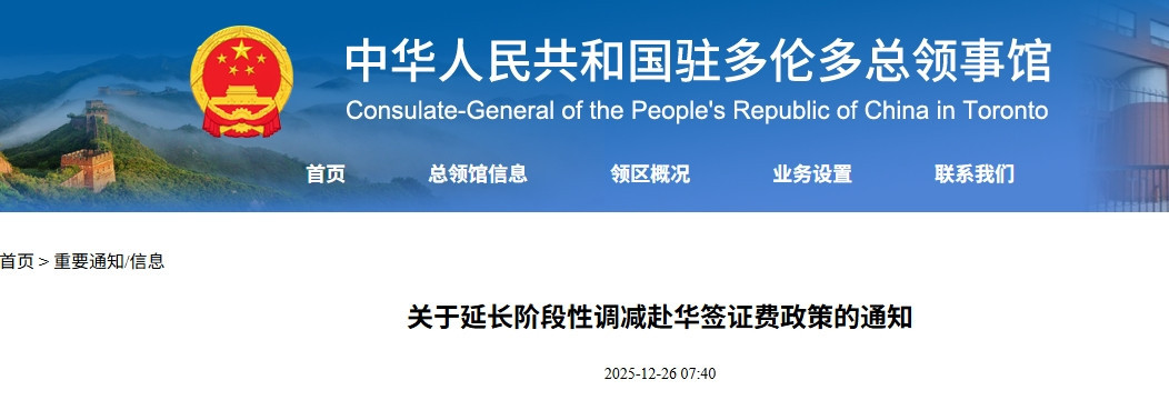 ![]()  驻多伦多 总 领 馆通知:延长调减赴华签证费政策一年