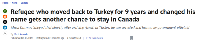 一名土耳其公民此前在加拿大被取消难民身份,原因是他涉嫌在加拿大银行存入伪造支票,并返回土耳其生活了9年。如今,他成功争取到一次机会,重新申请恢复其在加拿大的受保护人身份。 The above picture comes from "加国无忧CA" 根据多伦多联邦法院近日作出的一项裁决,Musa Durmus于2001年1月在加拿大获得难民保护,理由是他“因政治活动以及库尔德人身份而担心遭受迫害”。 裁决书称,Durmus在加拿大生活了12年多后返回土耳其。回国后,他通过行贿一名法官更改了自己的名字,在当地生活了大约9年,期间结婚、生子,并育有两名孩子。 裁决指出,Durmus“只有小学五年级左右的教育程度,英语能力有限”。 他在获得难民身份后不久便申请了加拿大永久居民(PR),但“该申请多年未获处理,在2012年1月他离开加拿大时仍处于待审状态”。 裁决还提到,Durmus声称他返回土耳其不久后就被政府人员逮捕并殴打。 “随后不久,Durmus通过行贿合法更改了自己的名字,并以新名字取得了土耳其国民身份证和护照。在接下来的大约九年里,他一直生活在土耳其,有工作、结婚、买房,并育有两个孩子。” Durmus还声称,在此期间他在土耳其持续参与政治活动,并于2016年因相关活动再次被拘留并遭到殴打。重返加拿大 妻子和孩子获准提交难民申请 2021年3月,Durmus与妻子和孩子离开土耳其。 “他们经墨西哥进入美国,大约两个月后,也就是2021年5月,Durmus进入加拿大。之后,他的妻子和孩子也进入加拿大,并获准提交难民申请。其家属的难民申请,基于与Durmus的关联而获批,”裁决写道。 在其妻子和孩子的案件中,难民保护处(Refugee Protection Division,缩写RPD)认为:“鉴于其丈夫/父亲过去曾被拘留,以及他在加拿大库尔德社区中的高度参与,如果这些申请人返回土耳其,因与他的家庭关系,极有可能面临构成迫害的伤害。”曾在土耳其改名 加拿大难民身份被终止 Durmus回到加拿大后不久,当时的加拿大移民部长向难民保护处(RPD)申请,终止其《难民公约》下的难民身份。 RPD在2023年9月裁定,Durmus“自愿重新寻求并接受了土耳其的国家保护”,因此失去了在加拿大的受保护人身份。 裁决指出,RPD并未就他当初离开加拿大的具体原因作出明确认定。“RPD认为,即便完全采信Durmus对事件的说法,他返回土耳其的行为仍属自愿。 RPD综合考量了多个因素,包括他对移民后果的不了解,以及他采取的安全措施(如改名),但最终认定,鉴于他在土耳其停留的时间长度及活动性质,已经可以认定其有重新接受原籍国保护的意图。此外,RPD还认为,Durmus实际上获得了外交保护。” 联邦法院法官Lobat Sadrehashemi在1月9日的裁决中写道,Durmus于2012年1月离开加拿大的具体情况“并不清楚,且RPD最终也未作出裁定”。 裁决称:“移民部长方面指称,在离开加拿大前几天,Durmus曾在一家加拿大银行存入伪造支票。大约10个月后,约克区警队对其发出了逮捕令。” 约克区警队于2023年5月将Durmus逮捕,并以使用伪造文件及5,000加元以上诈骗罪名对其提起指控。这两项指控的涉案日期均为2012年1月3日,但最终在2023年10月5日被撤销。 Durmus则作证称,他返回土耳其是因为“父亲在前一年做了手术,加上自己因多次接受加拿大安全情报局(CSIS)问询而出现心理健康问题,以及永久居民申请长期拖延”。法官撤销之前的决定 批准司法复核 法官认为,本案的“关键争议点”在于RPD如何看待他在土耳其改名一事。 “RPD接受了Durmus曾经改名,并在土耳其九年中的大部分时间使用另一个名字生活的事实,”Sadrehashemi说。 “但RPD对这一关键问题的处理方式,以及改名这一行为如何影响其对‘是否有意重新接受原籍国保护’及‘是否实际获得保护’的分析,并未作出充分解释。该裁定不合理,因为它无法让人理解决策者在关键问题上的推理过程,也留下了直接影响案件结果的重要疑问。” 最终,法官批准了Durmus的司法复核申请。 Sadrehashemi表示:“2023年9月14日作出的RPD决定被撤销,案件将交由另一名裁决人员重新审理。” 来源: 加国无忧 编辑(Edit)     删除(Delete) |