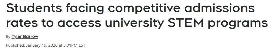 图源:CTV News 12年级学生Asiya Iskander平均成绩高达93%,但在申请卡尔加里大学(University of Calgary)生物科学专业时,仅被列入候补名单(wait-list)。 她说:“这真的让人心碎,因为我确实认为自己的申请材料已经足够有竞争力了。” Iskander希望未来从事心胸外科(cardiothoracic surgery),她同时也申请了生物医学科学专业,目前仍在等待结果。 这正是全省众多申请科学、技术、工程和数学(STEM)专业学生的现实写照。