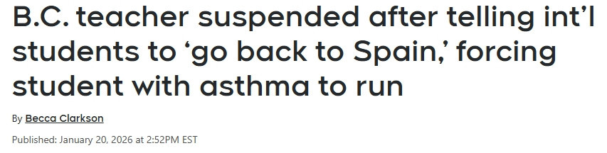 卑诗省Maple Ridge–Pitt Meadows学区一名任教多年的高中体育教师,因在课堂上对两名国际留学生发表不当言论,并在另一事件中忽视学生健康状况,被认定存在职业失当,遭到短期停职处分。 省教师监管专员认定,该教师未能营造包容、尊重的学习环境,也未能充分保障学生的身心安全。