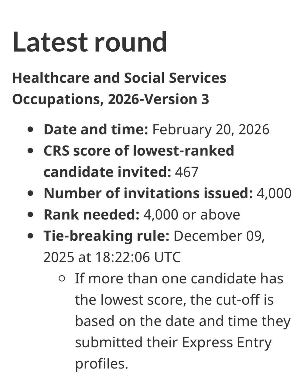 本轮(第398轮)抽签核心信息 日期:2026年2月20日 类别:医疗保健与社会服务(2026版第3版) ITA数量:4000 CRS最低分:467 平局时间:2025年12月9日18:22:06 UTC 如果你的分数是467,必须在该时间点之前递交Profile,才会被邀请。