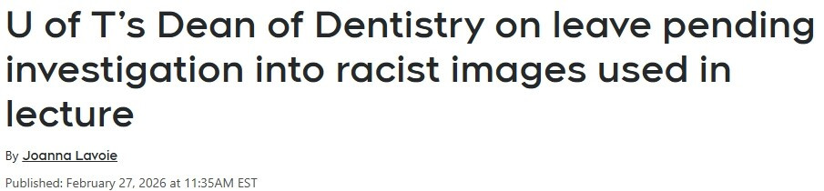 图源:Jeff Comber/ CTV News 在提供给CP24的一份声明中,多伦多大学副校长兼教务长Trevor Young表示,涉事教授“已承诺将全面配合调查”,并将在调查结果出炉前继续休假。 Young在邮件中写道:“院长表示,他在使用这些图片时,并未意识到其中包含反犹太主义和歧视含义,也未意识到这些内容会对犹太裔同事和学生以及更广泛的学习环境产生负面影响。他已将相关图片从课程材料中删除,并已向课堂学生以及整个牙科学院正式道歉。” 他还补充说:“他也承诺将在未来更加谨慎地审查课程材料,以支持一个包容和尊重所有人的学习环境,并进一步提升自己对反犹太主义及其他形式歧视问题的理解和认识。” 多伦多大学表示,目前不会就此事件发表进一步评论。