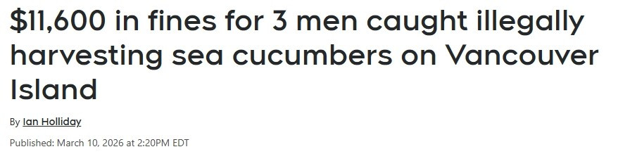 ![]()  加拿大华人非法捞海参被抓!3人狂捞43只,被罚超1.1万