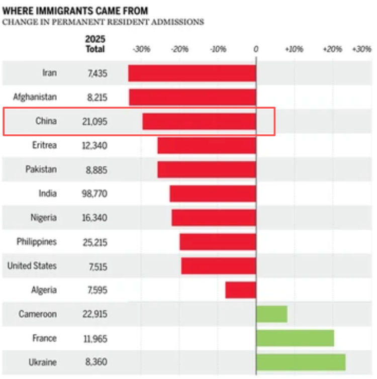 与2024年相比,2025年难民入境人数下降了23%。所有省份的难民入境人数均有所下降,其中萨斯喀彻温省降幅最大(下降32.5%),安大略省、新斯科舍省和纽芬兰省降幅次之,均为26.5%。降幅最小的是爱德华王子岛省(5%)和魁北克省(5.5%)。 2025年全国家庭担保移民的入境人数下降了10%。降幅最大的将是卑诗省(13%)和安大略省(11%)。 虽然全国经济移民人数下降了 19%,但爱德华王子岛 (P.E.I.)(下降 47%)和新斯科舍省 (Nova Scotia)(下降 40%)的降幅尤为显著。西北地区虽然移民人数一直处于较低水平,但该类别移民人数却增长了 16%,魁北克省是唯一另一个经济移民人数增长的地区,增幅为 2.8%。 杰德瓦布说:“魁北克几乎未受移民部这些削减措施的影响。” “魁北克与联邦政府达成协议,因此永久居民的待遇没有减少。 而安大略省的减少幅度也远小于加拿大其他地区。从某种程度上说,如果魁北克省没有受到任何影响,那么加拿大其他地区的削减幅度就更大。” 加拿大移民的来源地也发生了变化。 2025年,加拿大永久居民PR人数有所下降,且其来源国的移民人数波动较大。 来自伊朗和阿富汗的永久居民人数降幅最大,分别下降了33.3%和33.1%。