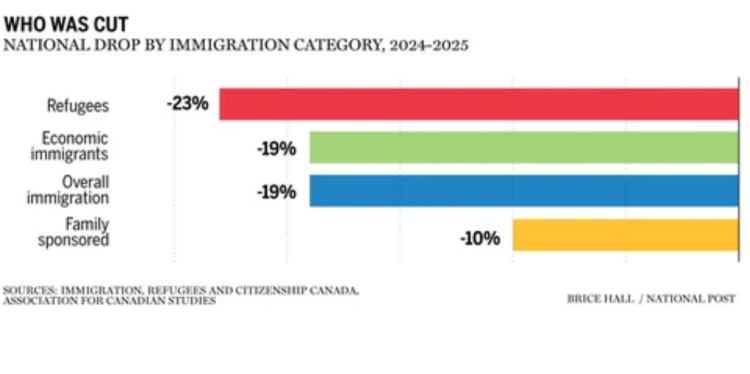 在经历了多年创纪录的移民潮之后,加拿大去年接收的移民人数大幅下降,这是自2015年特鲁多当选以来,非疫情期间罕见的下降。 根据联邦政府最新数据,2025年加拿大移民人数比2024年减少了19%;这意味着新移民总数为393,530人,而前一年为483,655人。 这是自2020年以来加拿大移民人数的最低水平,当时新冠疫情大幅减少了国际旅行,这与过去十年移民人数加速增长的趋势背道而驰。 根据加拿大研究协会 (ACS) 对政府数据的分析,2025 年加拿大移民数量的变化因地区而异。 加拿大研究协会主席杰克·杰德瓦布 (Jack Jedwab) 表示:“不同类别和地区的移民削减幅度相当不对称且不均衡。” “由于移民是人口增长的唯一来源,这种不均衡的削减意味着加拿大某些地区的人口下降幅度将大于其他地区。” 移民数量降幅最大的是大西洋沿岸省份和草原省份;其他大多数省份的移民数量略有下降。 具体来说, 2025年, 爱德华王子岛去年的移民人数减少了44%,是降幅最大的省份。萨斯喀彻温省的移民人数减少了40%,新斯科舍省减少了36%,阿尔伯塔省减少了32%,新不伦瑞克省减少了30%。 育空地区的移民人数下降了25%,曼尼托巴省下降了23%,卑诗省下降了20%,安大略省下降了18%,纽芬兰省下降了12%。 相比之下,加拿大有 三个地方的移民数量略有增长:努纳武特地区增长了 15%,西北地区增长了 4%,魁北克省增长了 1%。 分析显示,移民数量的减少并非均匀分布在各个移民类别中,难民受到的影响最大,其次是经济移民,然后是家庭担保移民。