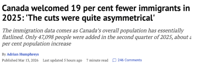 尼日利亚学生的留学签证发放数量下降了3.3%,从26,445份降至25,570份。这两个国家是2025年留学许可发放数量最多的三个国家。 至于外国临时劳工方面, 2025年,加拿大全国范围内获准入境的临时外籍劳工(TFW)人数将减少近12%,从190,945人降至168,245人。 临时外籍劳工人数的下降幅度在曼尼托巴省最为显著,该省从2024年的4,715人降至去年的3,315人,降幅达29.6%;其次是阿尔伯塔省(从24,845人降至17,990人,降幅为27.6%)、魁北克省(从56,000人降至16.6%)和萨斯喀彻温省(从3,315人降至2,845人,降幅为14%)。 移民数据公布之际,加拿大总人口基本保持平稳。2025年第二季度,加拿大仅新增47,098人,人口增长率约为0.1%。 如果限制新移民的计划继续实施,明年加拿大人口增长率应该会更低。 来源:约克论坛 编辑(Edit)     删除(Delete) |