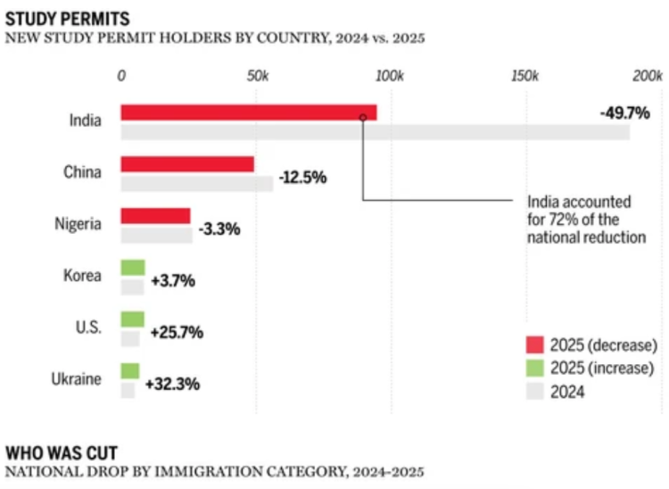 第三是来自中国的PR 永久居民 ,2015年只有 21,095名新移民, 下降幅度高达29.6%。 来自巴基斯坦和厄立特里亚的PR移民均下降了25.7%, 印度排在第6位,来自印度的PR移民下降了22.5%,2025年加拿大迎来近98,770名移民PR,比中国多了近5倍。 其他降幅显著的国家包括菲律宾(22%)、尼日利亚(20%)、美国(19.5%)和阿尔及利亚(8%)。 国际留学生方面, 从全国范围来看,2025年国际学生学习签证持有者的数量比2024年下降了25%以上。这意味着加拿大将减少131,010份新的外国留学生。 来自印度的学生签证去年大幅下降了50%,从188,175份降至94,605份。这意味着学习签证总数下降的72%都影响到了来自印度的学生。 2025年,中国学生的留学签证发放数量下降了12.5%,从56,175份降至49,125份;