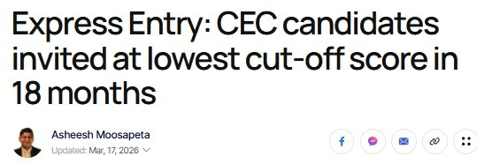 图源:canada.ca 此次抽签是2026年的第16次EE抽选,也是今年第5次CEC类别抽选。 截至目前,CEC抽签已成为2026年第二频繁的抽选类型,同时也是发出邀请数量最多的类别,截至今天,已发出28,000份ITA。 2026年的EE抽选显示,加拿大移民部门主要将重点放在境内申请人,尤其是拥有省提名或加拿大工作经验的候选人。 截至目前,2026年IRCC已通过以下各类抽选发出49,604份ITA,其中CEC候选人最受青睐,包括: • 加拿大经验类(Canadian Experience Class):28,000份 • 法语能力类别(French-language proficiency):14,000份 • 医疗与社会服务类(Healthcare and social services):4,000份 • 省提名计划(Provincial Nominee Program):2,583份 • 具有加拿大工作经验的医生(Physicians with Canadian work experience):391份 • 具有加拿大工作经验的高级管理人员(Senior Managers with Canadian Work Experience):250份 来源:加国无忧 编辑(Edit)     删除(Delete) |