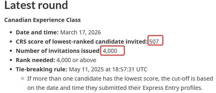 图源:51记者拍摄 加拿大移民、难民及公民部(IRCC)通过快速通道(Express Entry)系统再次发出了新的申请邀请(ITA)。 本轮抽签中,移民部门向加拿大经验类(CEC)候选人发出了4,000份邀请。 要参与此次抽签,候选人需要满足以下条件: • 综合排名系统(CRS)最低分数为507分; • 在2025年5月11日晚上6点57分之前创建Express Entry档案。