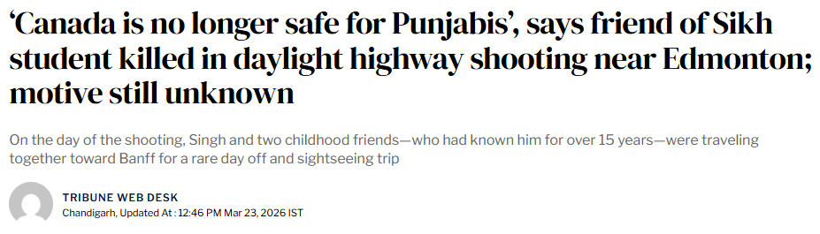 近日,一起发生在加拿大高速公路上的枪击案,让人不寒而栗。 一名来自印度旁遮普的22岁留学生,在埃德蒙顿附近的QEII高速公路上驾驶时遭枪击身亡。警方称,这是一起随机且令人震惊的暴力事件。 而就在几分钟前,他还在和朋友有说有笑,准备开启人生第一次前往落基山脉的公路旅行。