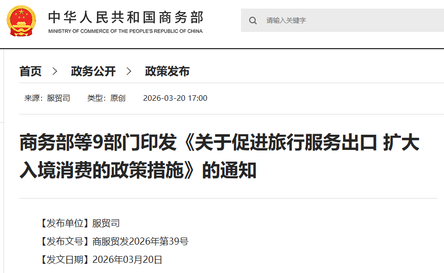 中国商务部等9部门于近日(2026年3月20日)正式印发《关于促进旅行服务出口 扩大入境消费的政策措施》。这份被称为“入境游全指南”的新政,从签证便利化、文娱消费、医疗旅游到数字化服务,全方位提升了外籍人员(包括持加拿大护照人士)赴华的体验。