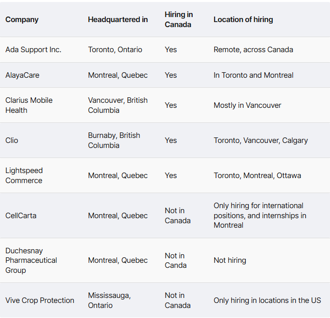 目前哪些公司正在招聘? Ada Support Inc. Ada Support Inc.是一家总部位于多伦多的客户服务公司,开发AI代理和自动化工具。公司成立于2016年,帮助大型企业通过聊天、消息和语音等渠道处理客户支持。 公司为远程办公模式,但表示全年会在多伦多市中心办公室安排线下活动和团队聚会。 公司福利包括股票期权、健康与生活补贴、育儿假补贴、无限带薪假期、学习与发展预算,以及1000元的家庭办公补贴。 目前Ada Support Inc.部分职位空缺包括: 客户解决方案顾问II(远程,加拿大) 高级需求增长经理(远程,加拿大) 培训工程团队负责人(远程,加拿大) 高级云安全工程师(远程,加拿大) 技术产品经理(远程,加拿大) 销售开发代表(多伦多) 高级数据分析师(远程,加拿大) AlayaCare AlayaCare成立于2014年,是一家医疗科技公司,为家庭护理和社区护理机构提供基于云的软件。 公司总部位于蒙特利尔,帮助护理机构管理接收、排班和薪资等运营流程。 在加拿大,该公司在多伦多和蒙特利尔均有职位空缺。员工福利包括灵活假期政策、健康福利、职业发展和内部流动机会,以及团队活动。 目前该公司部分职位包括: 客户成功项目经理(双语)(多伦多) 高级集成开发人员(多伦多) 产品经理(蒙特利尔) FP&A分析师(多伦多) AI与自动化专家(蒙特利尔) 客户赋能专员(多伦多)