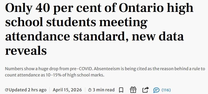 据《多伦多星报》报道,安省最新数据显示,仅有 40% 的青少年达到了高中的出勤标准。这一比例较疫情前下降了近 20 个百分点。