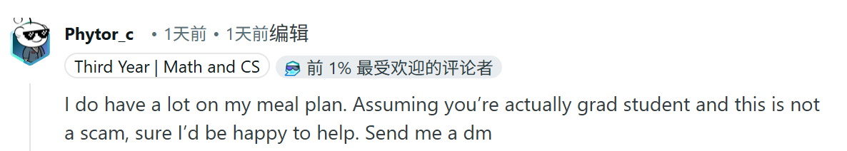 图源:51记者拍摄 另一位网友则表示,虽然 UofT 的博士资助比加拿大其他高校高,但和美国同类学校相比,尤其考虑到多伦多的高昂生活成本,实际并不宽裕:“我读硕士时不住市中心也只能勉强够花。” 还有人指出,博士奖学金最多发 5 年,很多人毕业遥遥无期,补助其实很难支撑长期生活。 生活压力下的温情与无奈 帖子中也不乏轻松调侃:“你有博士学位,可以家教或者找其他赚钱的路子吗?”也有人直接邀约:“要不要一起去 Duke 酒吧喝一杯?” 当然,也有不太友好的建议:“直接回你爸妈家吧。” 留学生生存现状的缩影 这则看似简单的求助贴,背后折射出多伦多高昂生活成本下,学生群体乃至留学生们面临的真实压力。即使是博士生,也难以完全摆脱经济困境。好在社群力量依旧温暖——既有陌生人的善意相助,也有经验分享和资源互补。 来源:Reddit 编辑(Edit)     删除(Delete) |
