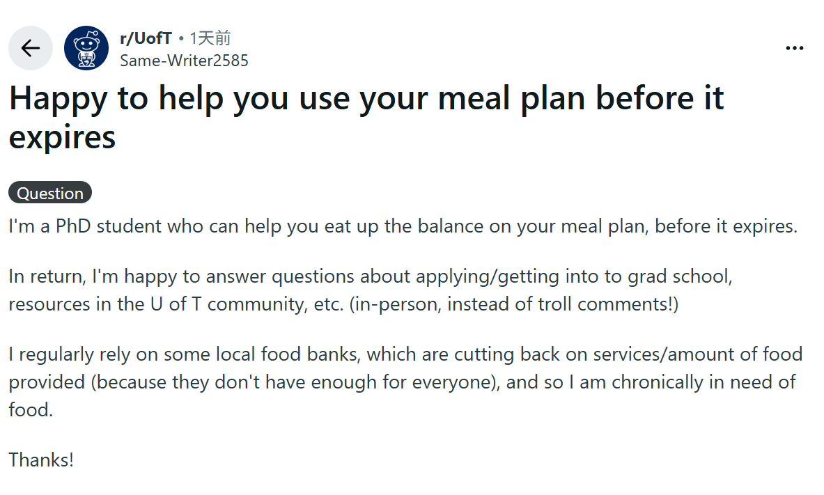 博士生在贴中写道:"我经常依赖本地食物银行,但现在供应越来越少,粮食短缺成了常态。如果你愿意让我帮你用掉你的饭卡余额,我很乐意当面为你解答升学、申请 UofT 研究生等问题。"
