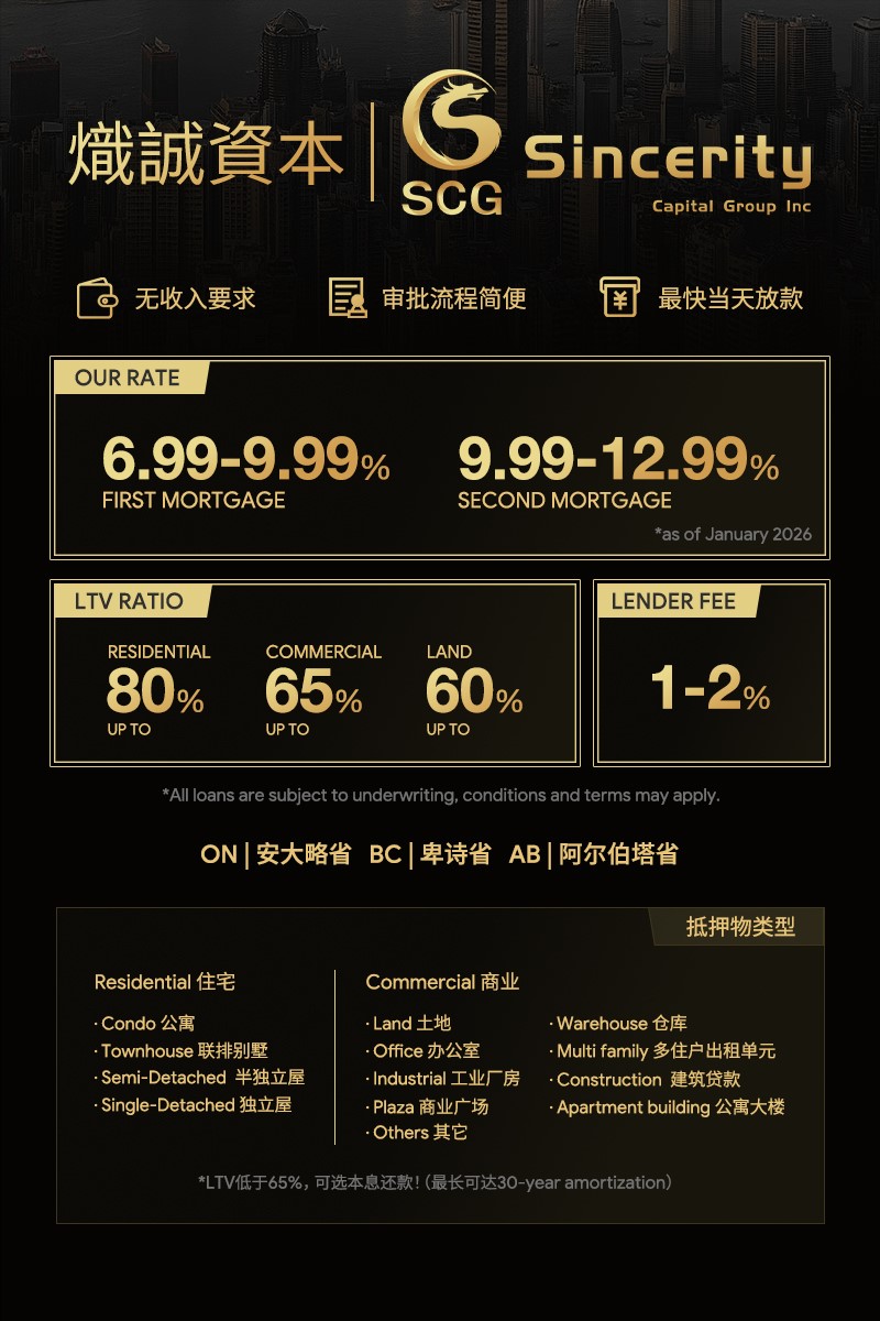 熾誠资本 Sincerity Capital Group | 专业私人贷款,方案灵活,费率更优 业务类别: 住宅贷款:公寓、联排别墅、半独立屋、独立屋 商业贷款:土地、办公室、工业厂房、商业广场、仓库、多住户出租单元、建筑贷款、公寓大楼等 覆盖区域 (包括但不限于): 安大略省:多伦多大区(GTA)、渥太华、汉密尔顿、尼亚加拉瀑布、伦敦、圣凯瑟琳、巴里 卑诗省:温哥华大区(GVA)、阿伯茨福德、维多利亚岛、基洛纳 阿尔伯塔省:卡尔加里、埃德蒙顿、坎莫尔、红鹿 审批流程简便: 最快当天放款,无繁杂材料审核流程,无收入要求。